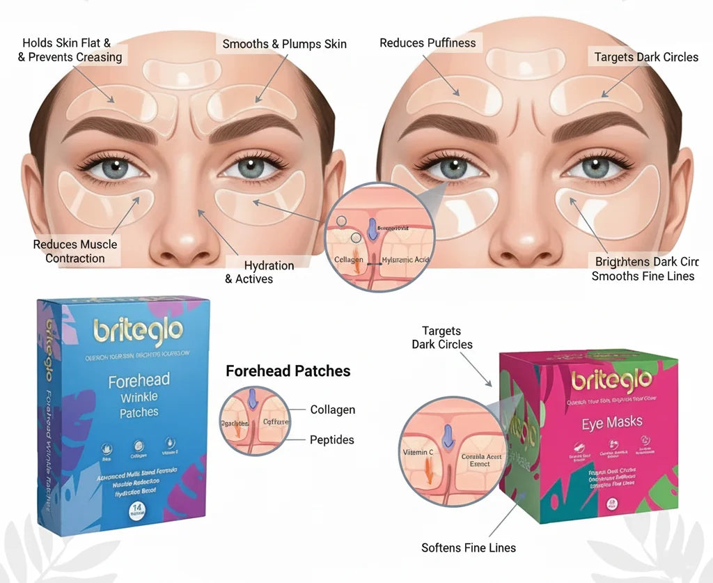 Targeted care, thoughtfully designed for real skin. The Starter Set Plus reflects the Briteglo approach to skincare: focused, effective, and easy to use. Rather than overwhelming your routine, this set delivers hydration and smoothing exactly where it matters most—the forehead and under-eye area. What makes this bundle different is its balance of simplicity and performance. The Forehead Wrinkle Patches help support smoother-looking skin through comfortable, occlusive wear, while the Under Eye Mask delivers concentrated hydration to refresh and soften the delicate eye area.